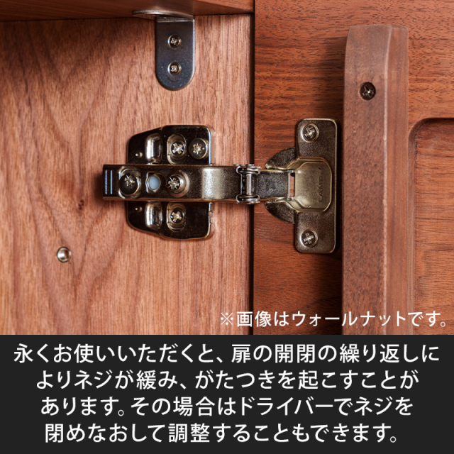 丁番の調整永くお使いいただくと、扉の開閉の繰り返しが原因でネジが緩み、がたつきを起こすことがあります。 その場合はドライバーでネジを閉めなおし調整することもできます。