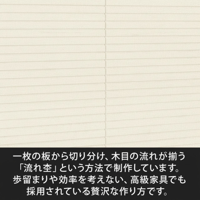 流れ杢一枚の板から切り分け、同じ木目が揃う(木目の流れが同じ)ような仕上がりをいいます。