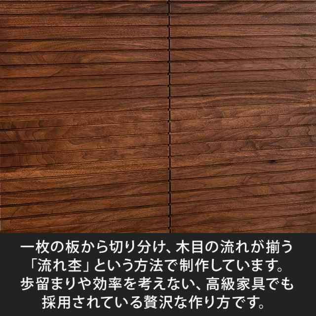 流れ杢一枚の板から切り分け、同じ木目が揃う(木目の流れが同じ)ような仕上がりをいいます。