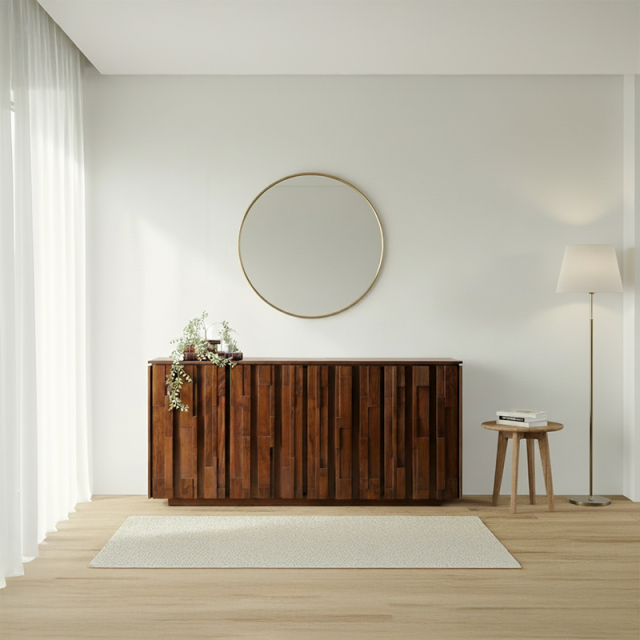 存在感のあるデザイン- 厚みや太さの異なったウォールナットの無垢材をランダムに配置し手の込んだつくりになっています。