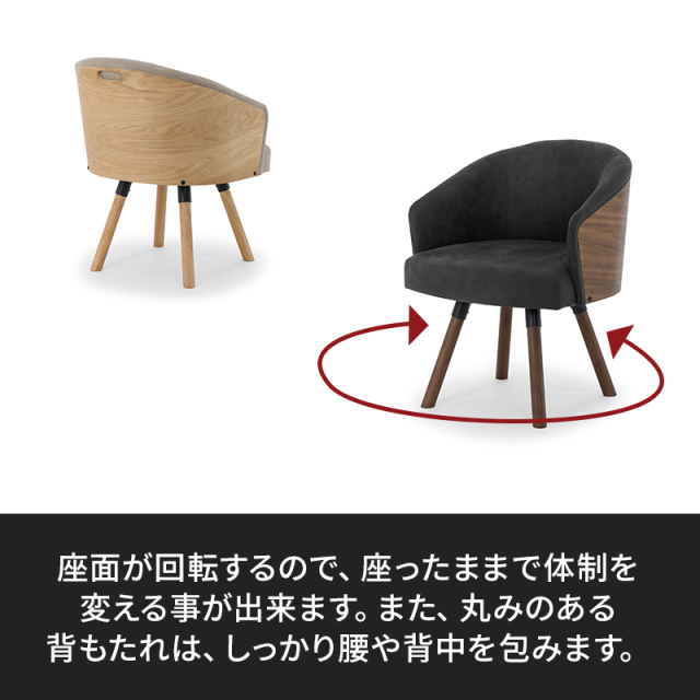 回転式チェア- 座面が回転するので、座ったままで体制を変えることができます。また、丸みのある背もたれは、しっかり腰や背中を包み込んでくれます。
