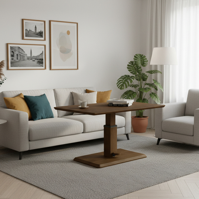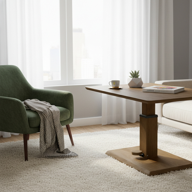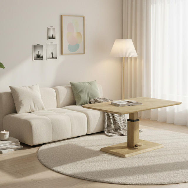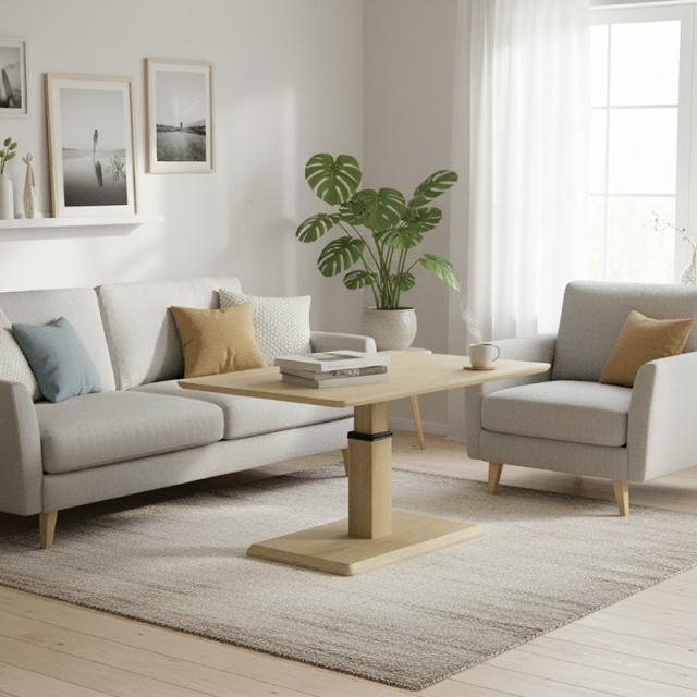 木目が美しいナチュラルモダンテイストのガス式圧昇降テーブル。