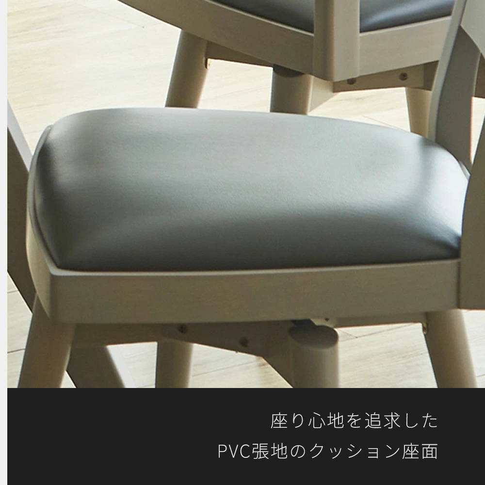 テーブル 天板:ラバーウッド 脚部:ラバーウッド 仕上げ:PU塗装 チェア 張地:PVC(合成革皮) フレーム(木部):ラバーウッド 仕上げ:PU塗装 |