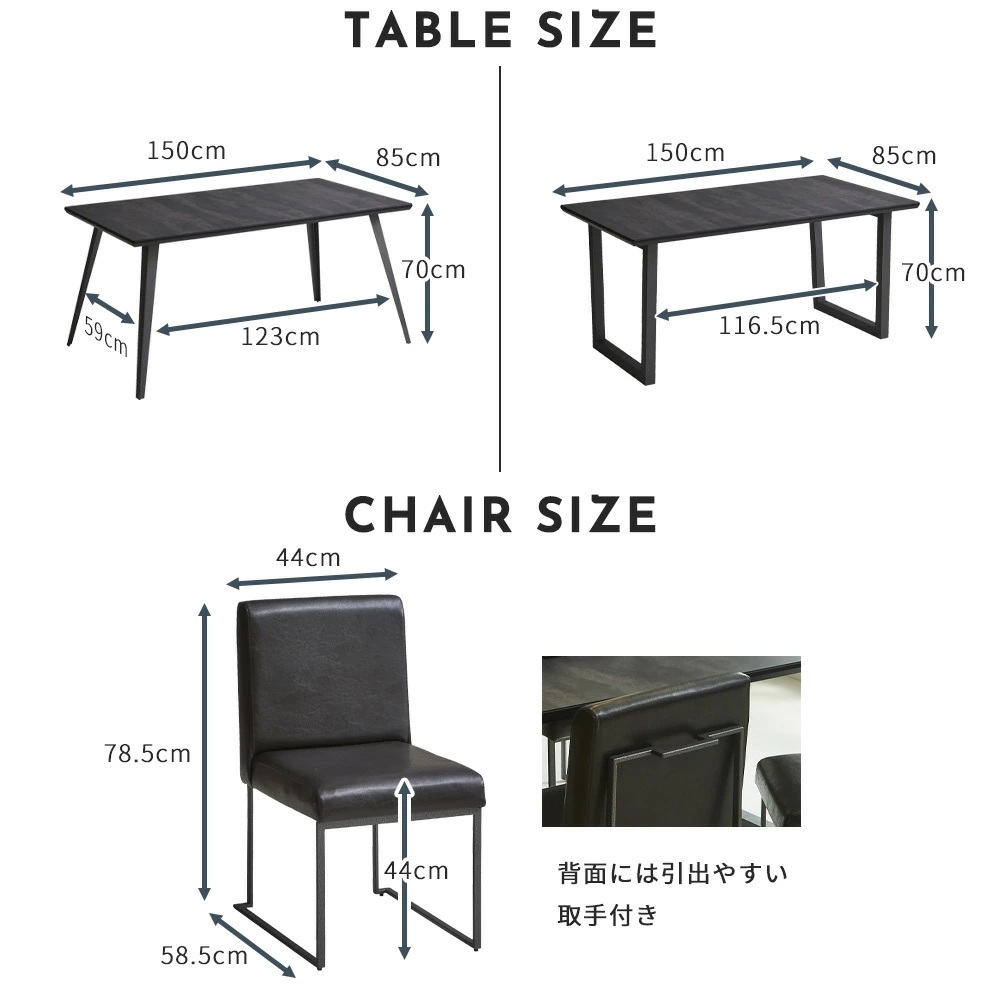 | サイズ | テーブル 外寸:幅1500mm 奥行:850mm 高さ:700mm チェア 外寸:幅540mm 奥行:590mm 高さ:710mm 座面高:440mm |