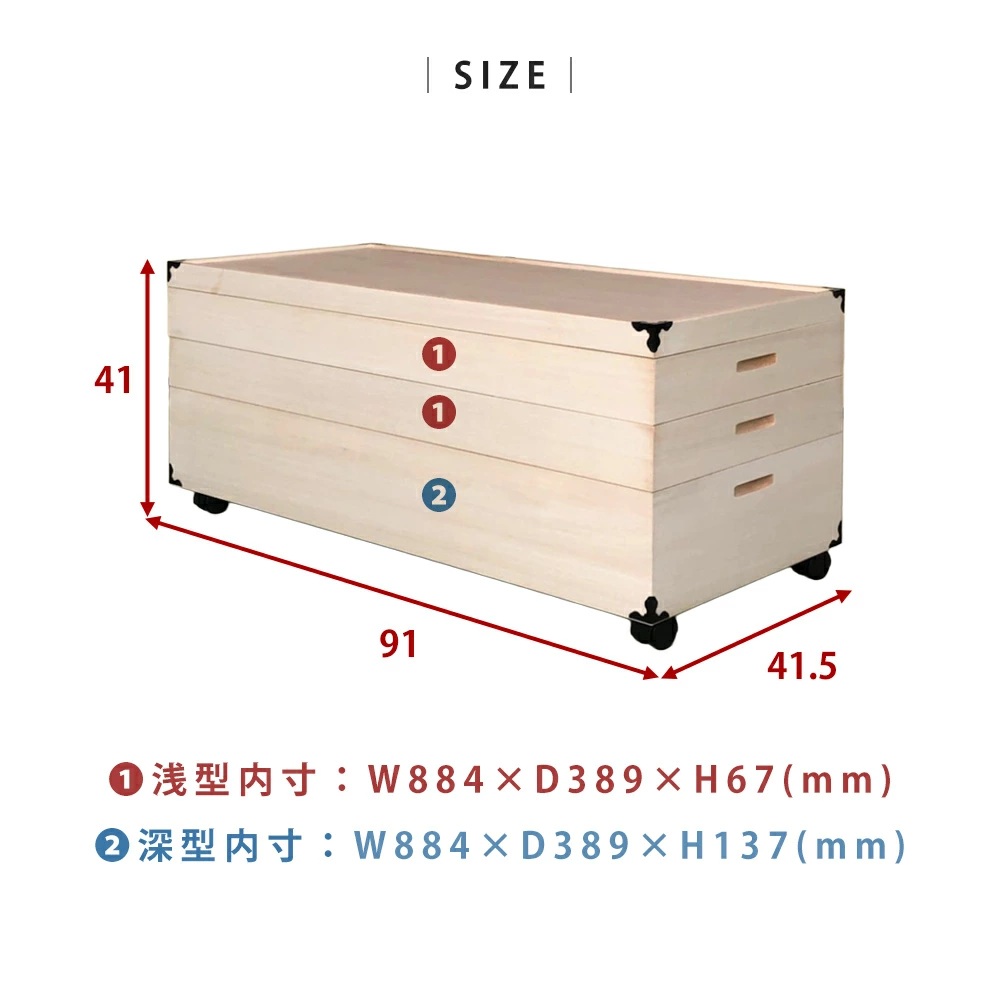 | サイズ | 本体:幅910mm 奥行:415m 高さ:410mm 浅箱内寸:幅884mm 奥行:389m 高さ:67mm 深箱内寸:幅884mm 奥行:389m 高さ:137mm |