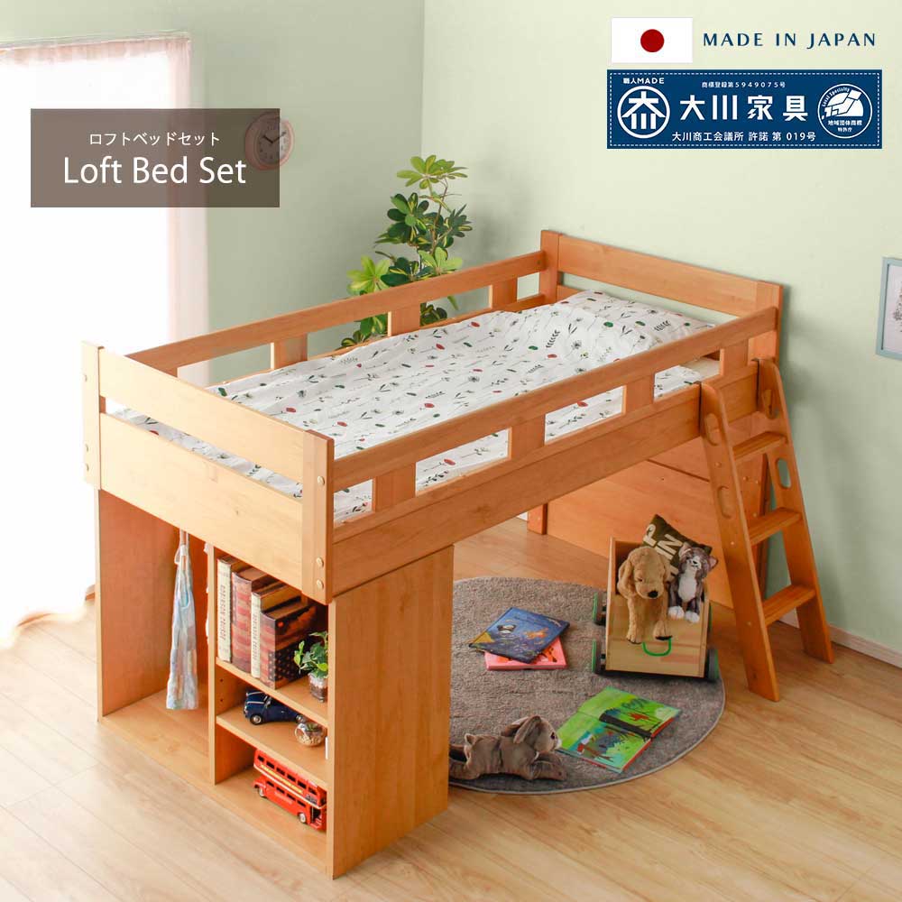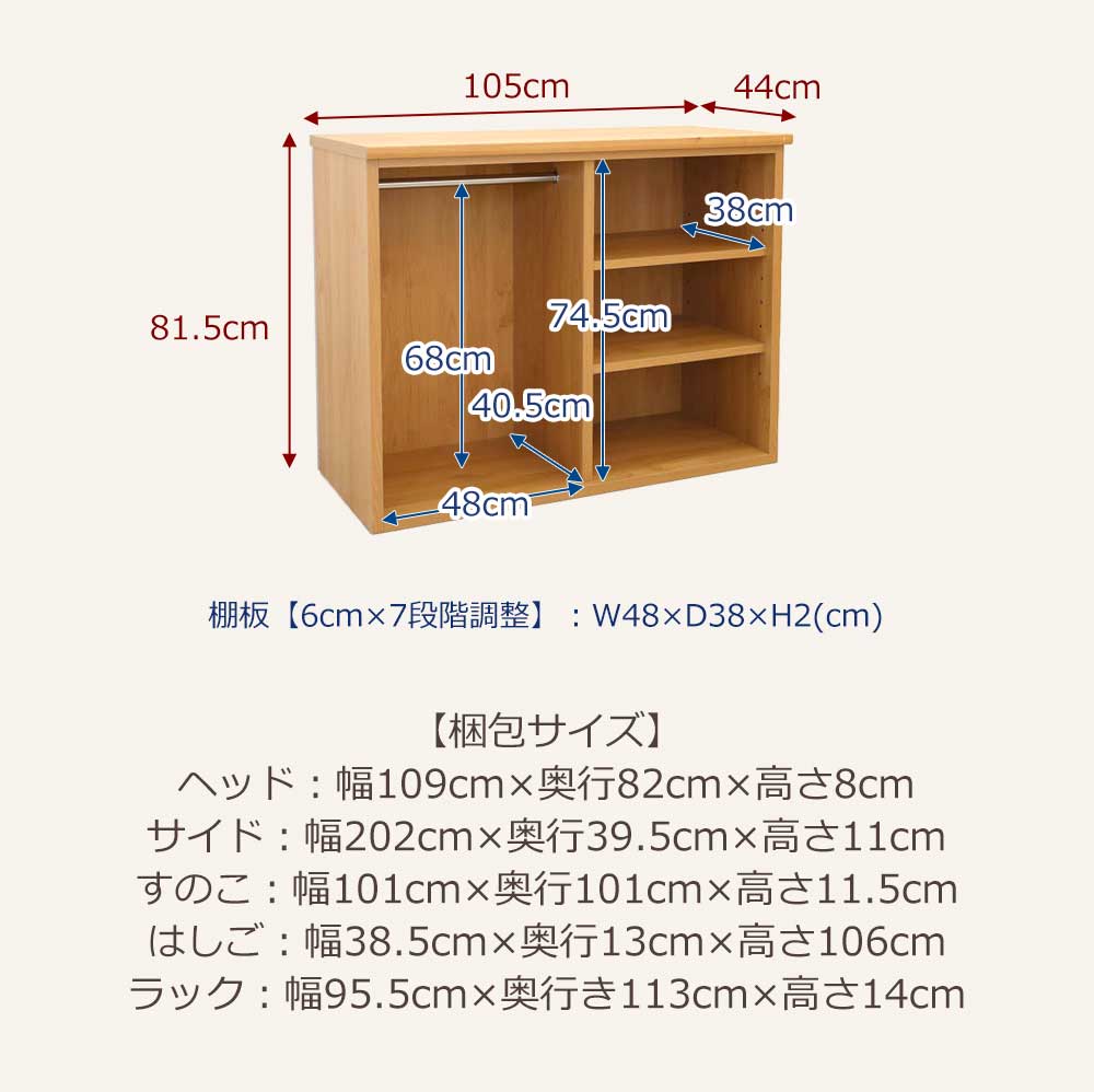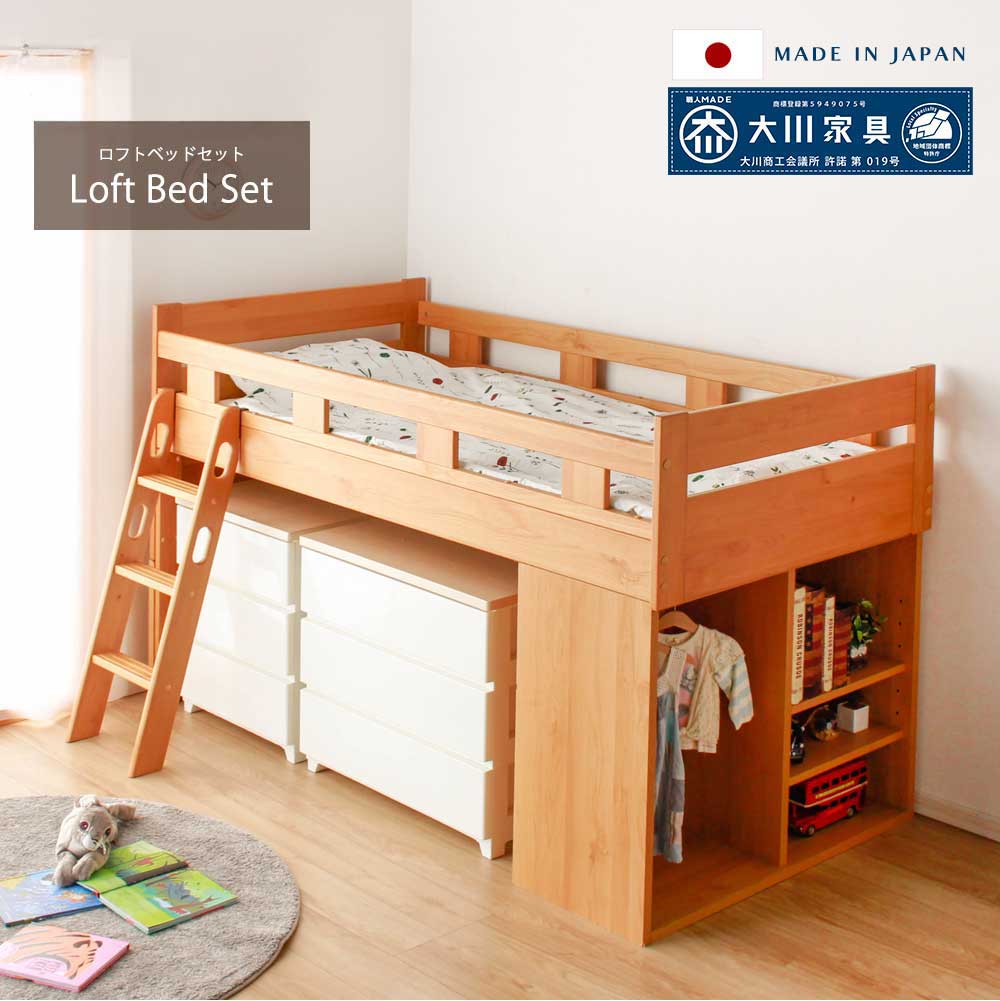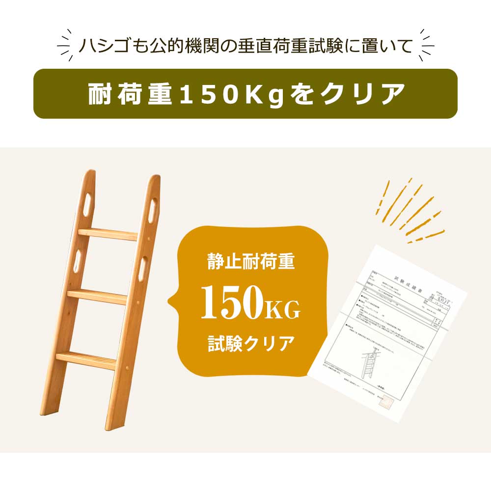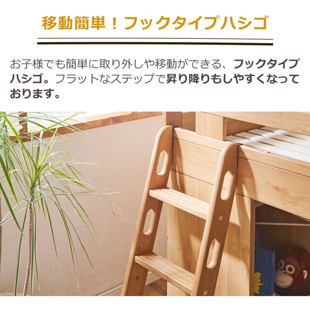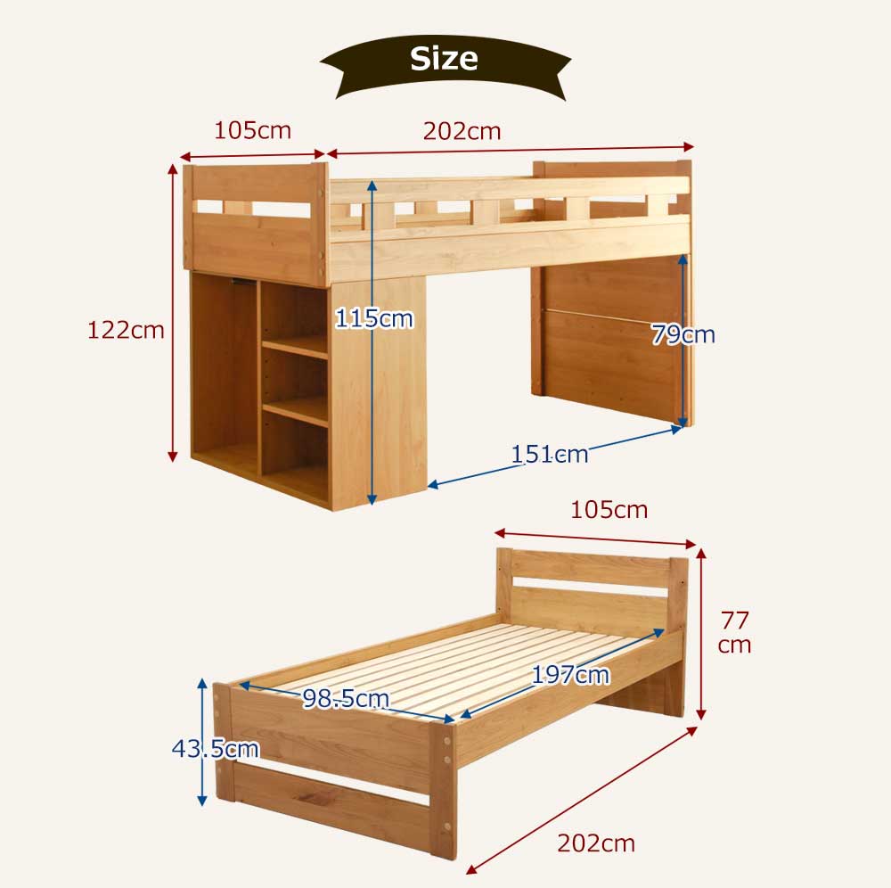 | サイズ | ・ベッド(ミドルベッド時):幅105cm×長さ202cm×高さ122cm ・ベッド(シングルベッド時):幅105cm×長さ202cm×高さ77cm ・ハシゴ:幅35cm×奥行10cm×高さ104cm ・シェルフ:幅105cm×奥行44cm×高さ81.5cm |