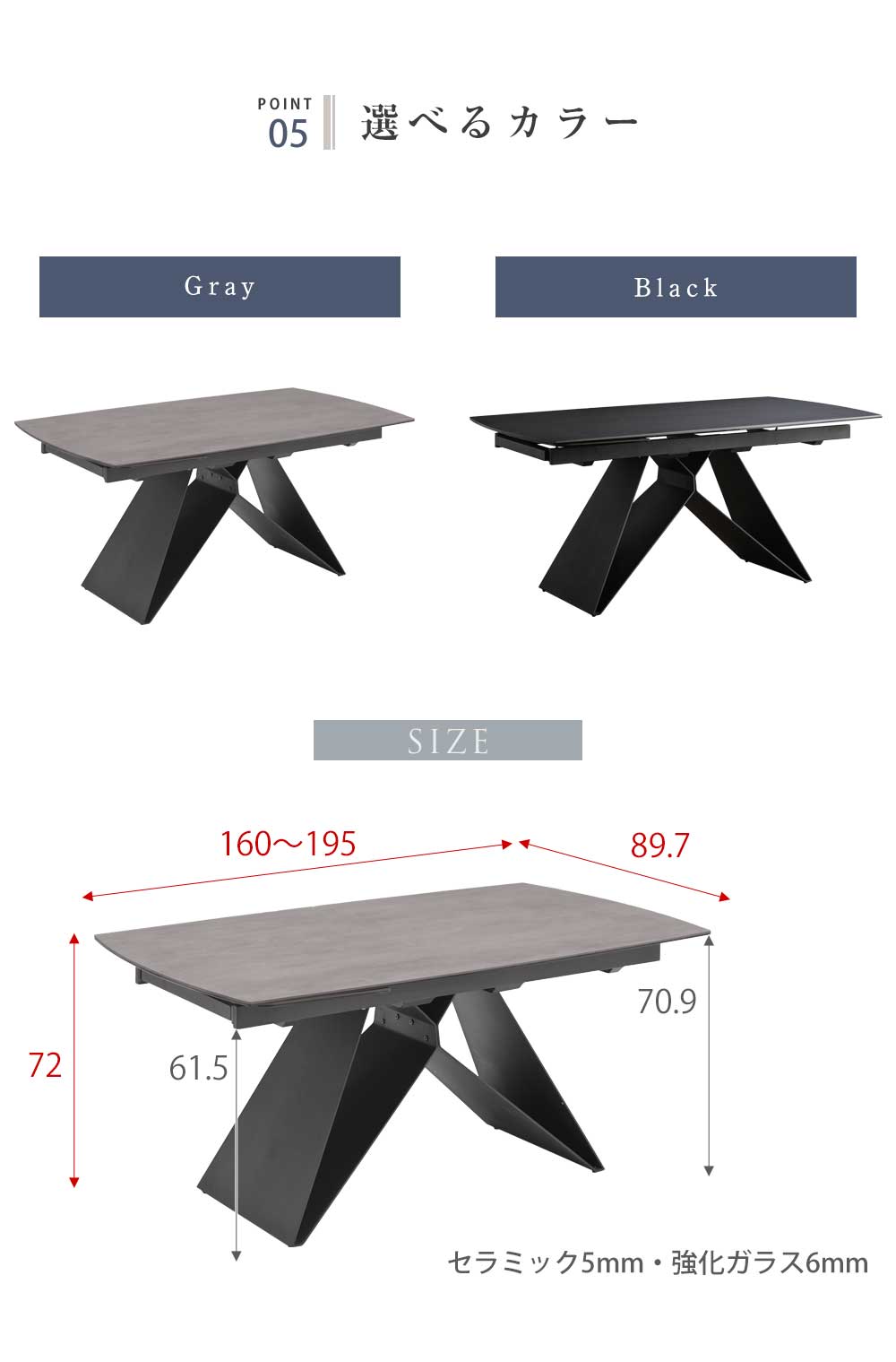 天板:6mm厚ガラス/5mm厚セラミック 脚:スチール 数秒でらくらく、スムーズに伸長 耐熱性あり、傷や汚れに強い天板 見る角度によって表情を変える重厚かつ洗練された脚 |