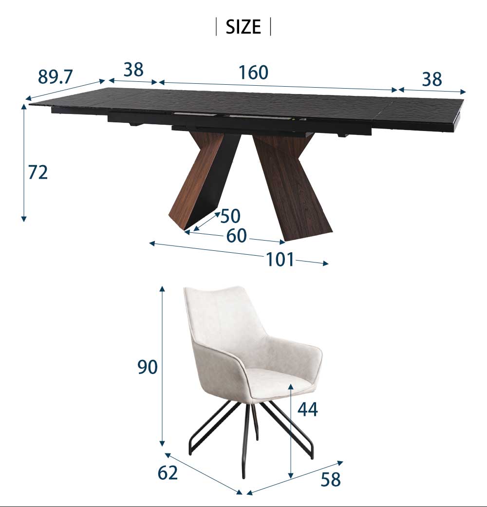 【テーブル】 幅1600?2360mmx 奥行897mmx 高さ720mm 【チェア】 幅580mm× 奥行620mm× 高さ900mm(座面高:440mm) ※梱包詳細※ テーブル:2個口 / 天板と脚部 チェア:1箱2脚入り |