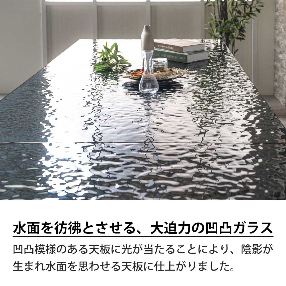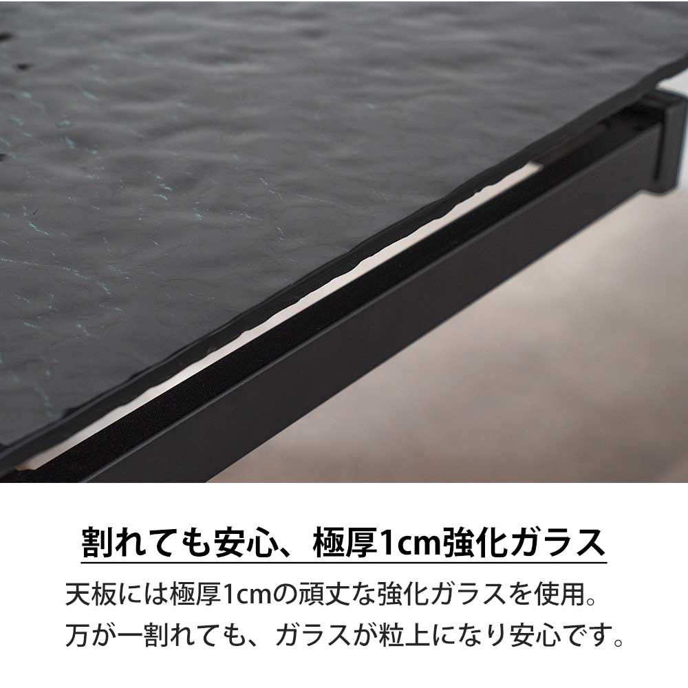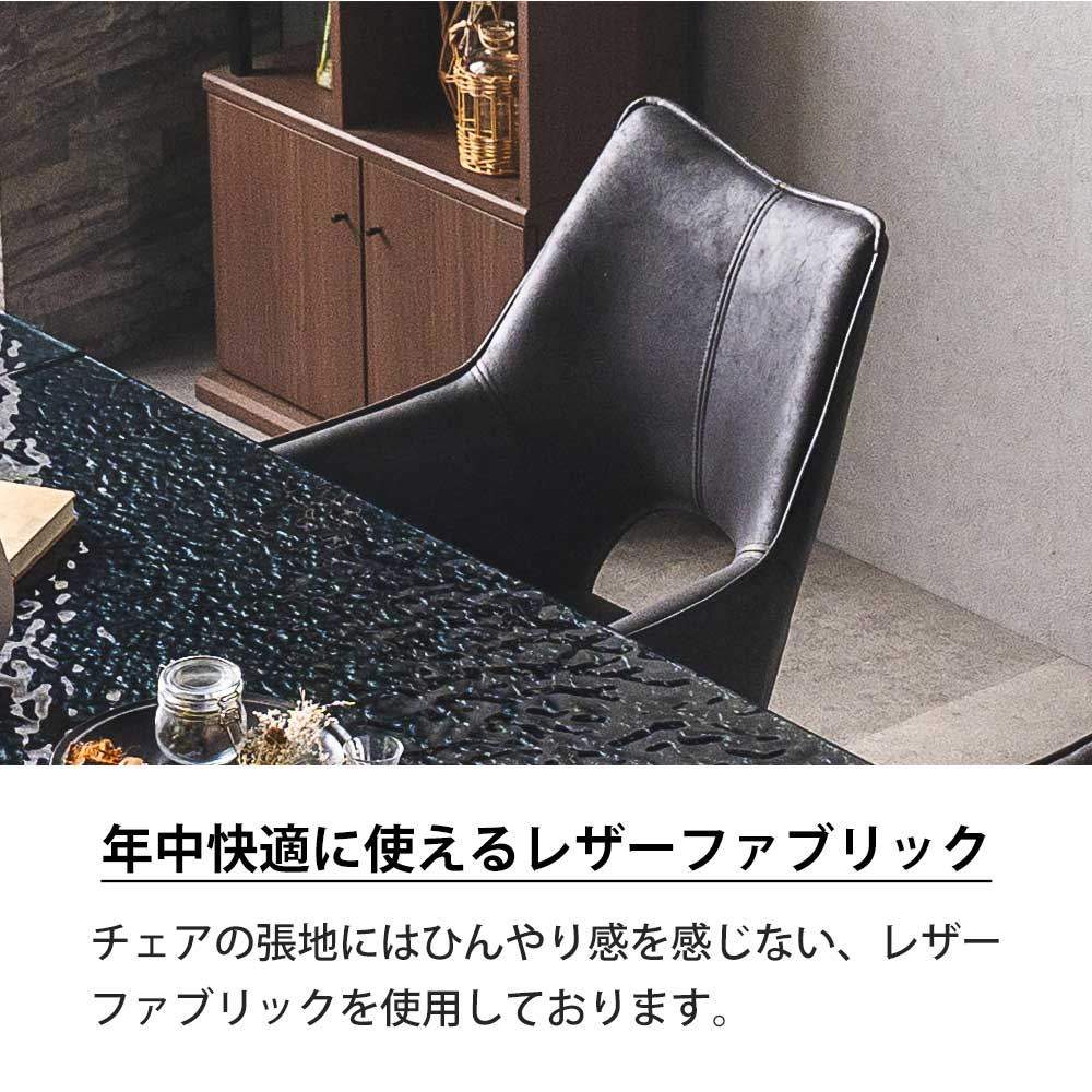 【テーブル】 天板:強化ガラス 脚部:MDFシート貼り 【チェア】 張地:レザーファブリック 脚部:スチール |