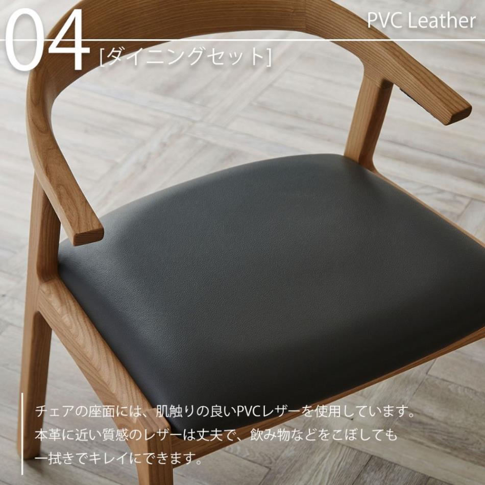 【テーブル】 天板部・脚部:アッシュ無垢集成材 塗装:PU塗装 【チェア】 フレーム(木部):アッシュ材 座面(張地):PVCレザー 塗装:PU塗装 |