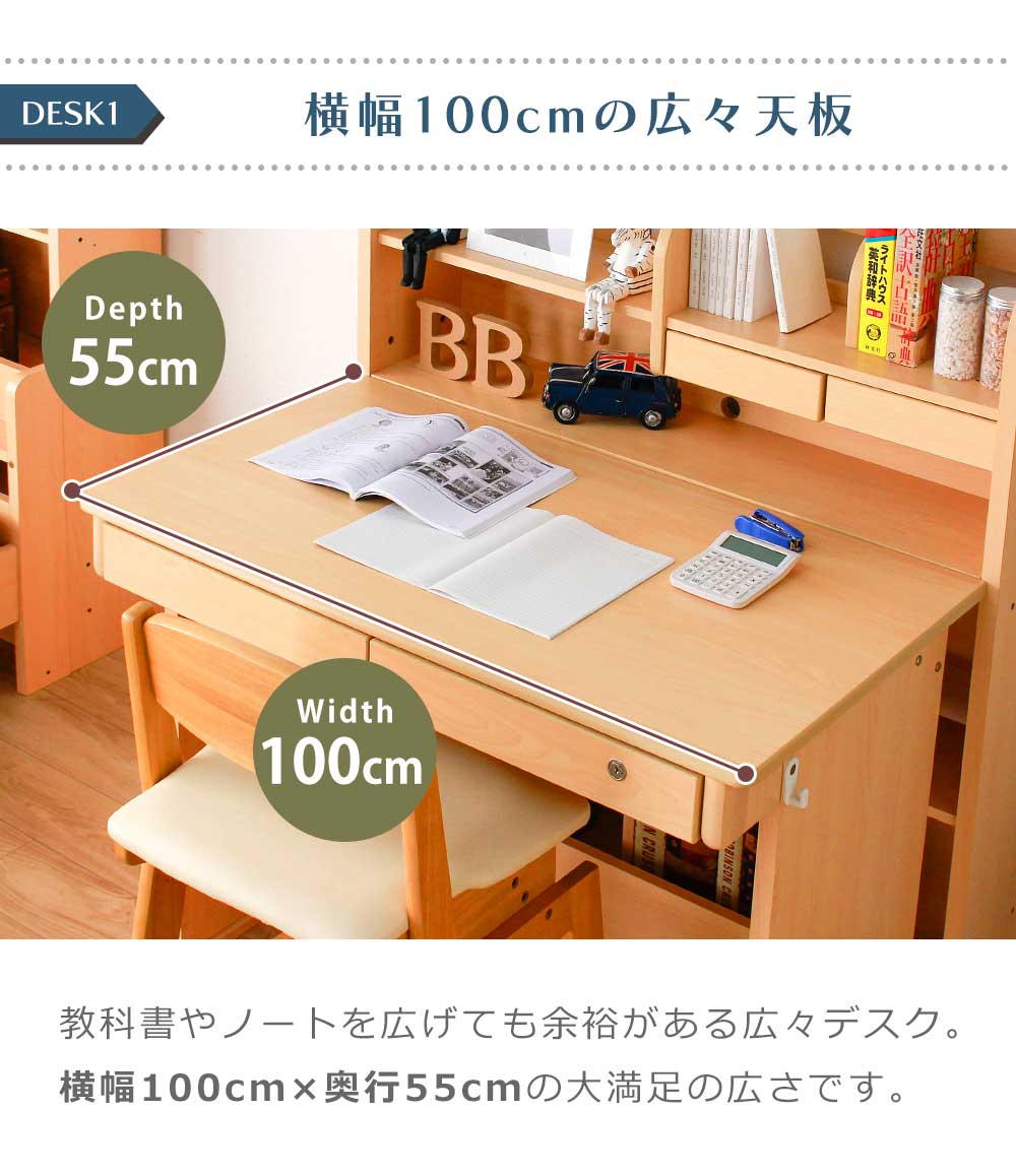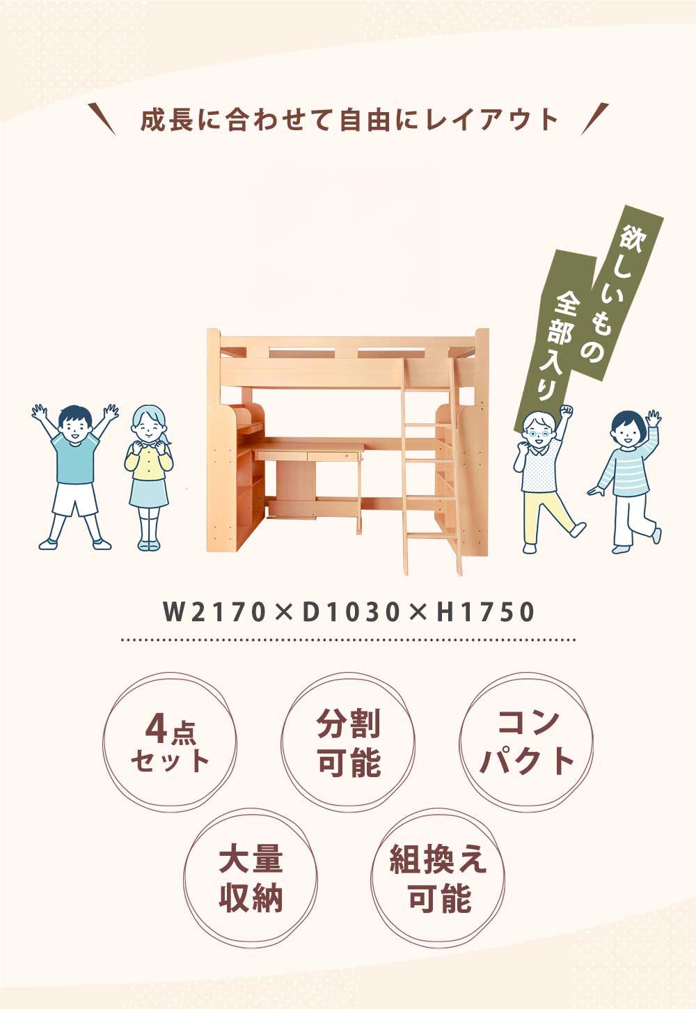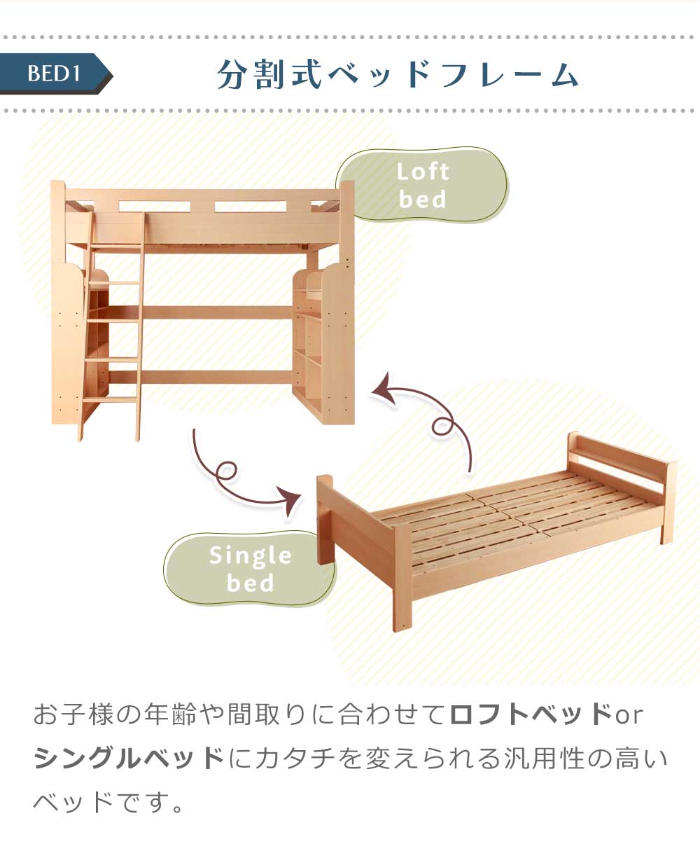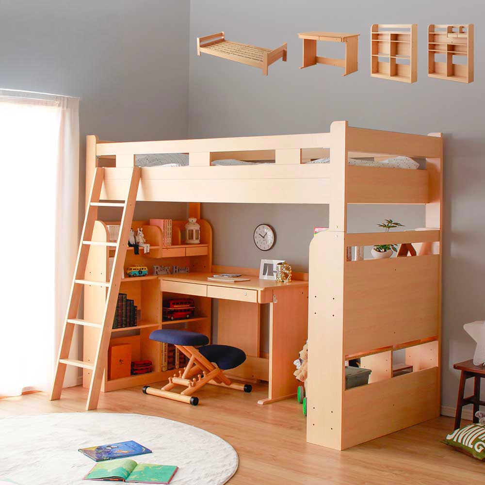 ロフトベッド時: 幅1030mm x 奥行2170mm x 高さ1750mm ロフト下部分[内寸]:高さ1305mm x 幅1700mm x 奥行1030mm シングルベッド時: 幅1030mm x 奥行2170mm x 高さ590mm デスク: 幅1000mm x 奥行550mm x 高さ760mm シェルフ: 幅1030mm x 奥行230mm x 高さ1160mm シェルフ(引出付): 幅1030mm x 奥行230mm x 高さ1160mm ハシゴ: 幅390mm |