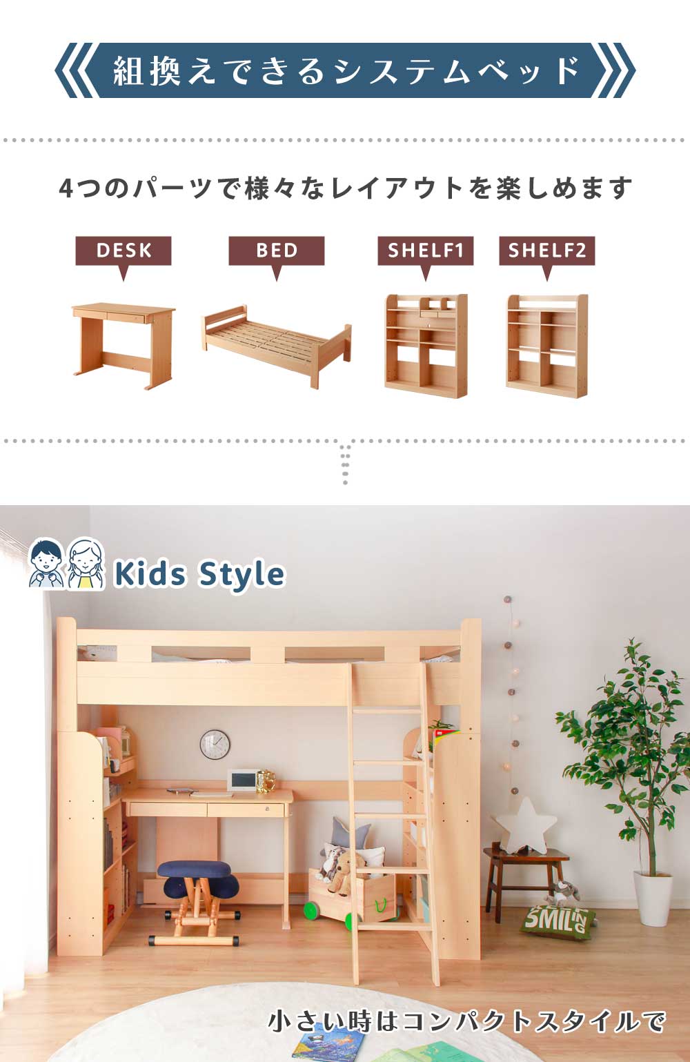 Grace システムベッド 分割可能 4点セット(ベッド + デスク + 書棚2個)
