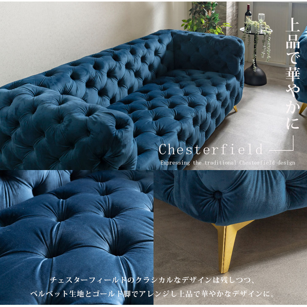 張地:ベルベット生地 中材:ウェービングベルト・Sスプリングバネ・ウレタンフォーム 脚部:スチール脚(ゴールド色) |