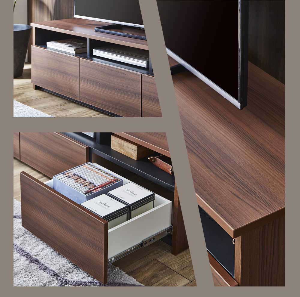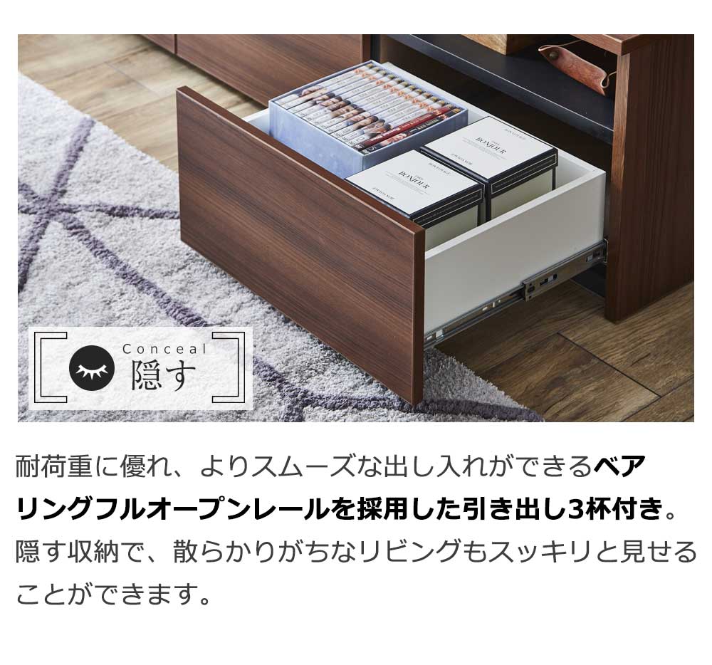 材質:MDF強化紙化粧仕上げ 日本国産 引出しレールにはベアリング入りフルオープンスライドレール採用 引出側板はラッピング加工 |