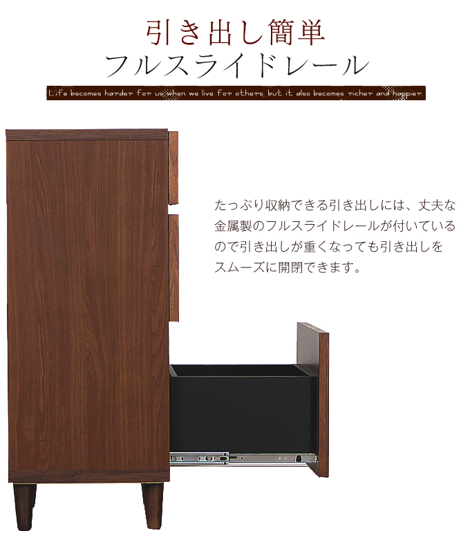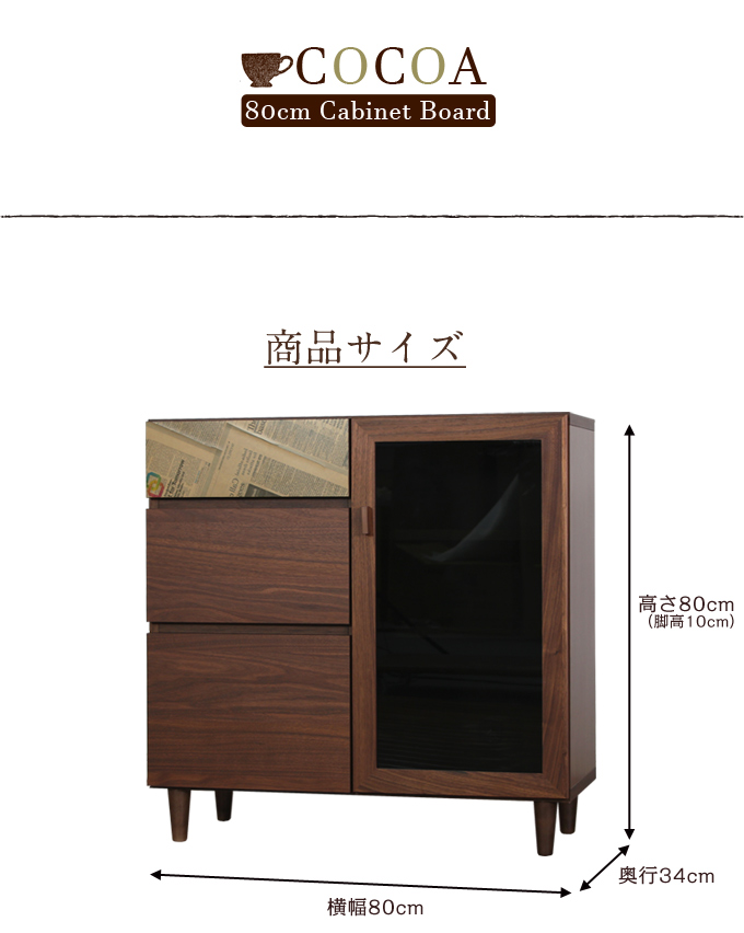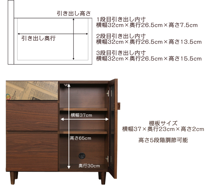 全体サイズ:横幅800mm×奥行340mm×高さ800mcm(脚高さ100mm) 引き出し内寸 1段目:横幅320mm×奥行265mm×高さ75mm 2段目:横幅320mm×奥行265mm×高さ135mm 3段目:横幅320mm×奥行265mm×高さ155mm 右フリースペース内寸:横幅370mm×奥行300mm×高さ650mm |